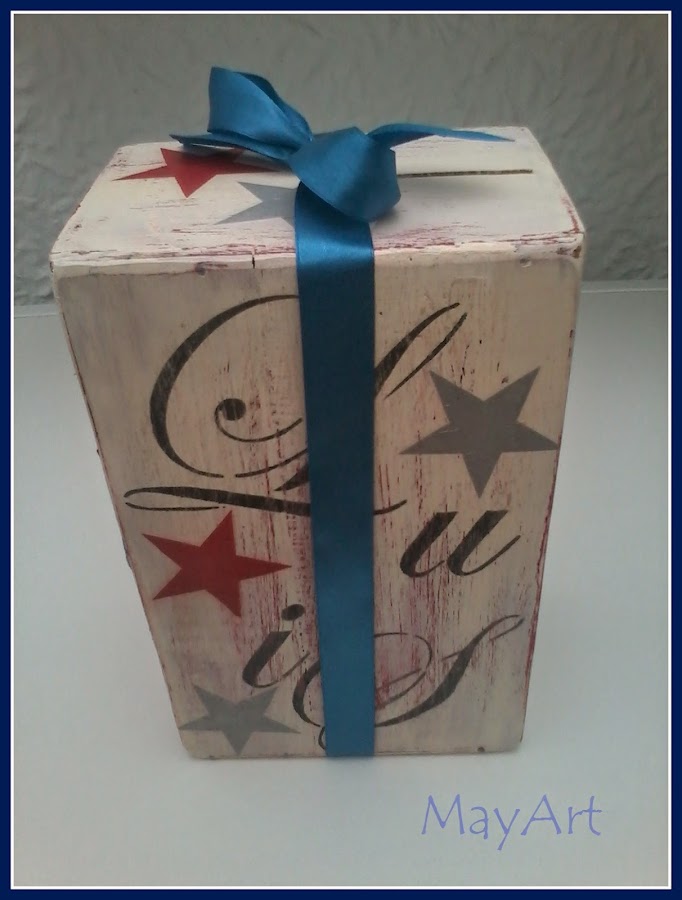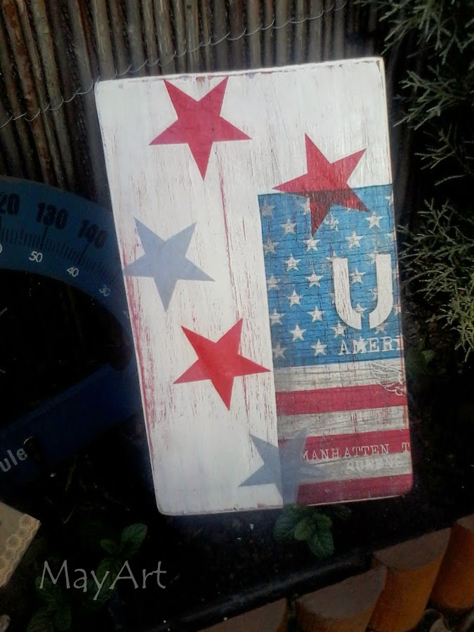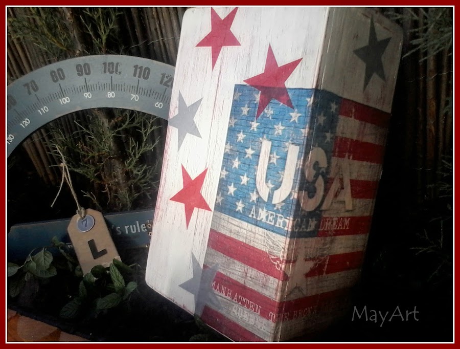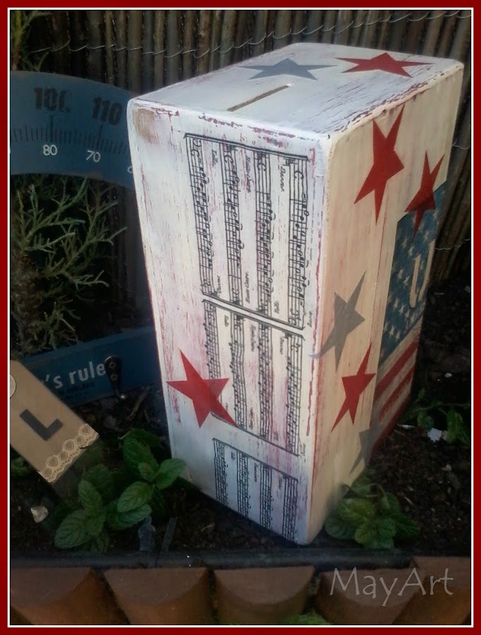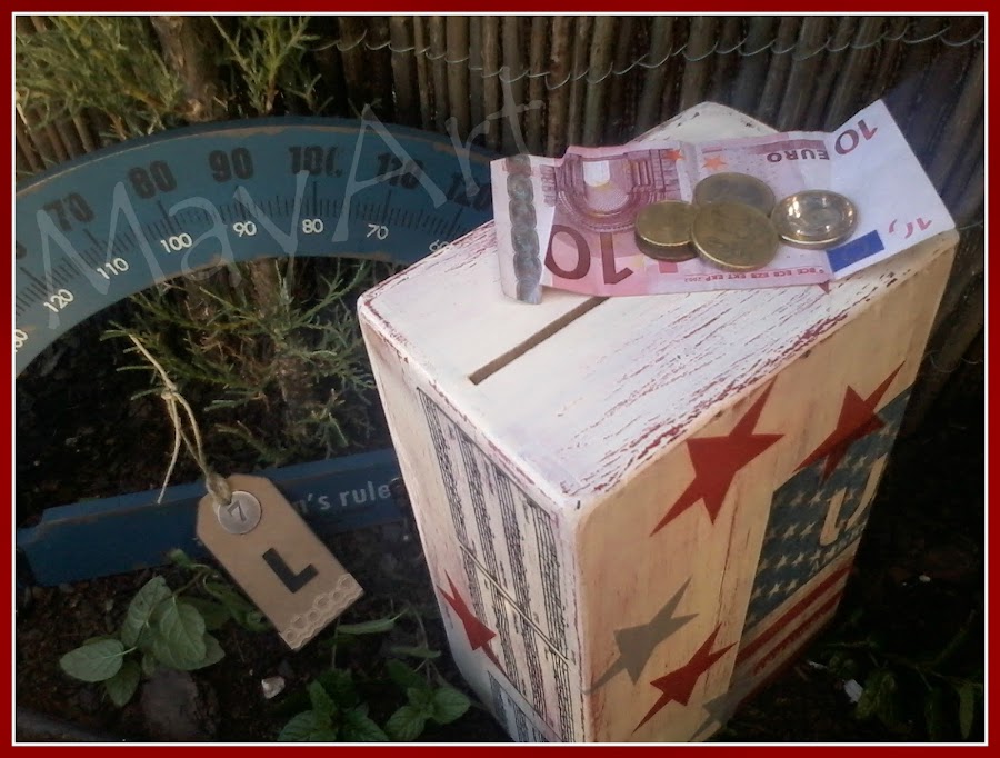 La de USA he usado un cuarto de la misma, bordeando una de las esquinas de la hucha. Las estrellas las fui recortando y pegando esporádicamente, como me iba pareciendo.