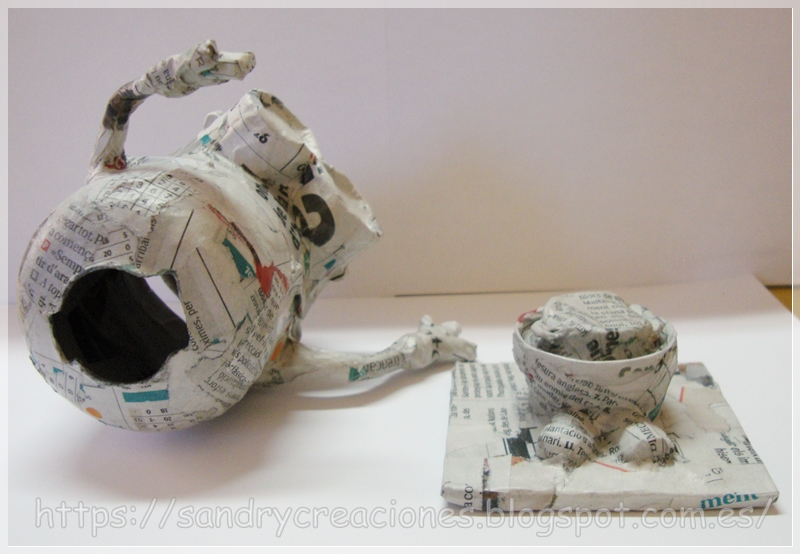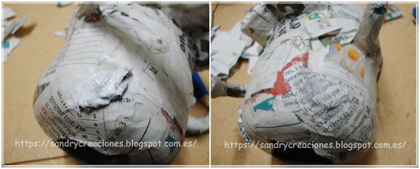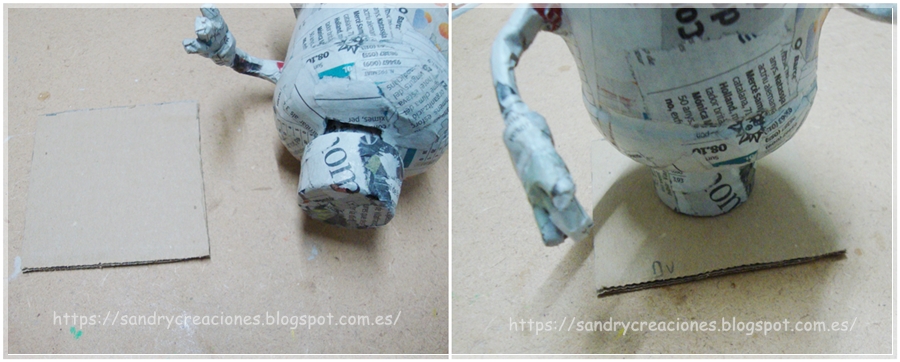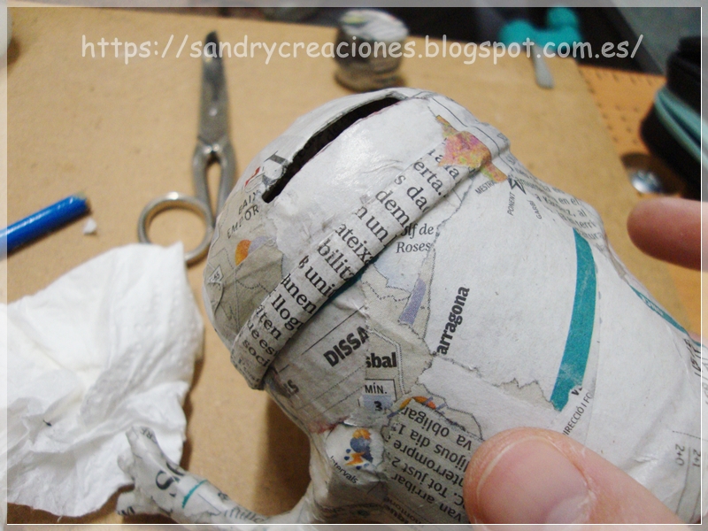Luego en la parte delantera, aunque no tenemos fotos, pegamos los pies utilizando 2 bolas alargadas de papel de periódico y dimos forma de embudo a la parte superior mediante tiras de papel de periódico para darle un mejor acabado a los pantalones y de paso esconder bien el cierre de la hucha. Luego le dimos dos capas de trozos papel de periódico y cola blanca rebajada con agua para reforzar la unión y darle resistencia a toda la base. Podéis ver en esta foto la base y el cierre terminados y listos para pintar.