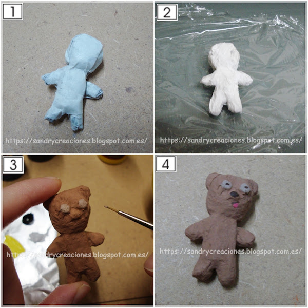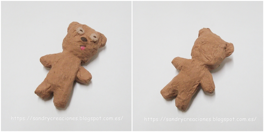 Una vez terminamos la estructura del osito lo pintamos con pintura acrílica marrón con las capas suficientes para que quede cubierto y seguidamente con otros colores le hacemos los detalles de la cara (imágenes 3 y 4).