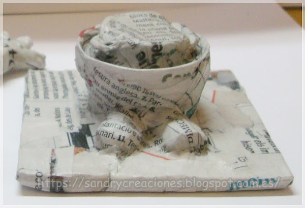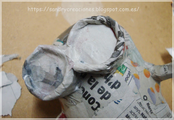 Una vez confeccionado al osito lo cubrimos con trocitos de papel de cocina y cola rebajada con agua para juntar todas las piezas (imagen 2). Esta vez empezamos realizando una capa con papel de cocina por el hecho de que es una figura más pequeña, de esta forma se delimitan mejor sus formas ya que el papel de cocina es más moldeable que el papel de periódico. Una vez seca esta primera capa le realizamos las orejas con unas bolitas pequeñas de papel de periódico y los detalles de los ojos y la nariz también con periódico. Una vez hecho esto cubrimos todo el osito con una capa de trozos de periódico muy chiquitos ya que este papel le dará más dureza. Finalizamos con otra capa de trocitos de papel de cocina porque le dejaba una rugosidad que nos pareció ideal para simular el pelaje del osito.