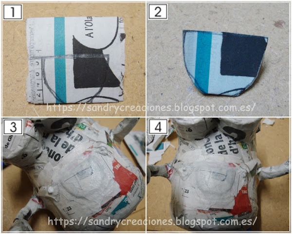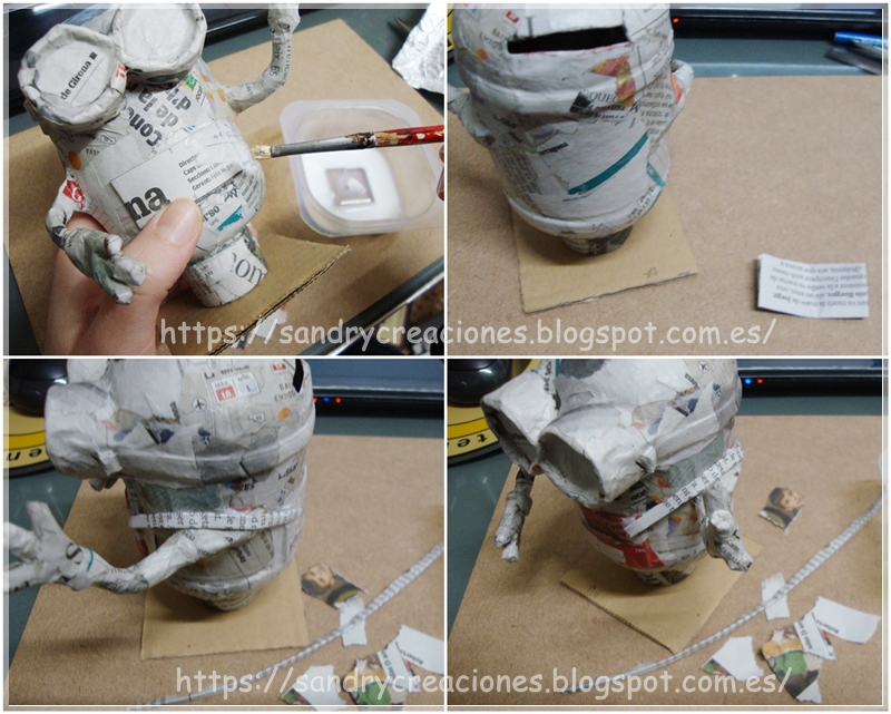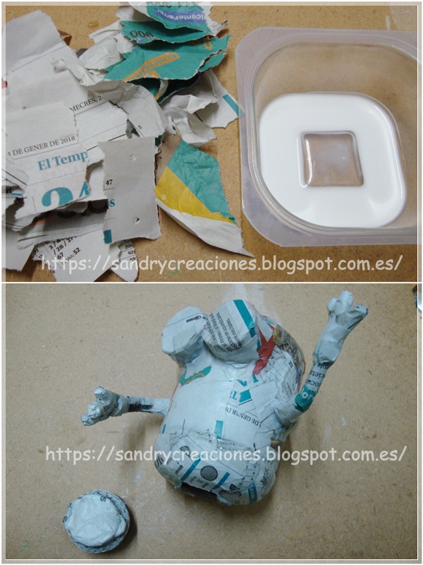 Una vez tuvimos realizados los rasgos más generales del Minion le dimos una primera capa de dureza al Minion con papel de periódico y cola rebajada con agua. Para eso cortamos con la mano trocitos de papel de periódico y los fuimos pegando con cola blanca rebajada con agua por toda la superficie del Minion y por la tapa de la hucha confeccionada a parte y que hemos explicado anteriormente.