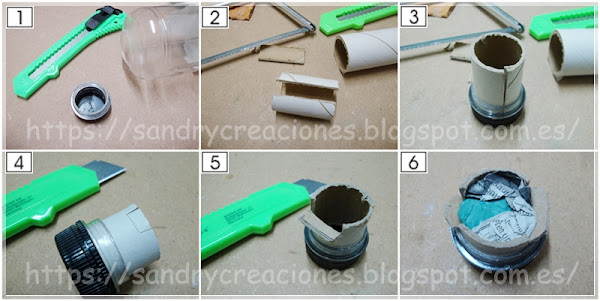 Finalmente nos decidimos por cortar el cuello de la botella (imagen 1) e idear un cierre de medio giro para poder abrir y cerrar la hucha a nuestro gusto. Para ello cortamos y adaptamos al cuello de la botella un trozo de tubo de cartón de film plástico de cocina (imágenes 2 y 3), una vez introducido el tubo de cartón en el cuello de la botella hicimos cuatro cortes, dos en un lado y separados por 1,5cm y los otros dos en el lado opuesto y separados 0,5cm y luego los doblamos hacia afuera dando como resultado dos pequeñas lengüetas de diferente tamaño (imágenes 4 y 5). Luego cortamos en la botella de agua dos encajes de la misma forma y en la misma posición que las lengüetas resultantes, para así poder insertar las lengüetas por ahí y dando medio giro conseguíamos cerrar la hucha. Luego llenamos el hueco del tubo de film de cocina con periódico (imagen 6) y dejamos la estructura preparada para cubrirla con trozos de papel de periódico y cola blanca diluida con agua para darle unión y resistencia.