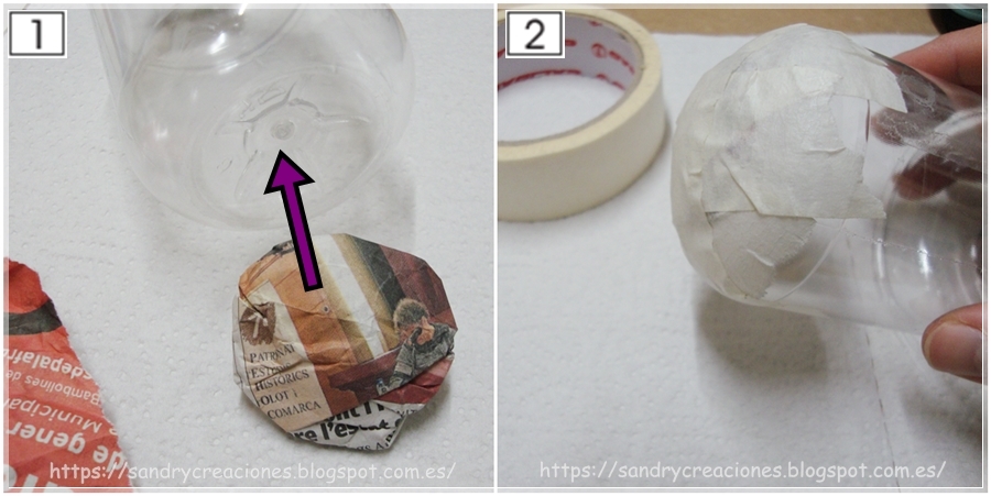 El primer paso que hicimos fue transformar nuestra botella de plástico y realizarle los retoques necesarios para convertirla en hucha y darle la forma redondeada del cuerpo del Minion. La botella que utilizamos nosotros ya tenía prácticamente la forma característica del cuerpo de un Minion, de hecho, como ya hemos dicho, fue precisamente la forma de la botella la que nos inspiró a hacer este tipo de personaje. Solo había un pequeño detalle y era que la parte inferior de la botella que sería la cabeza del Minion era más bien aplanada y nosotros la necesitábamos redondeada. Para darle la forma que necesitábamos utilizamos una bola de papel aplastada de periódico (imagen 1) a la que fuimos dando la forma que necesitábamos y la pegamos a la botella con cinta de carrocero (imagen 2).