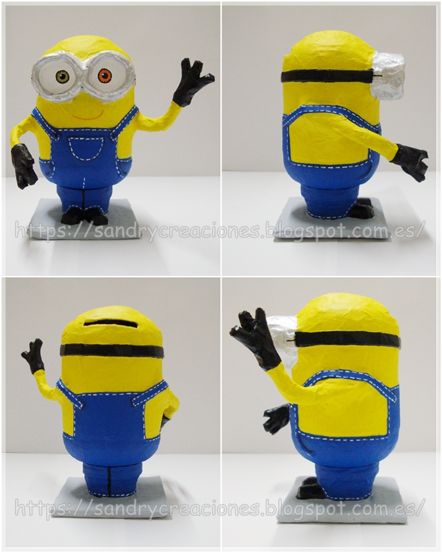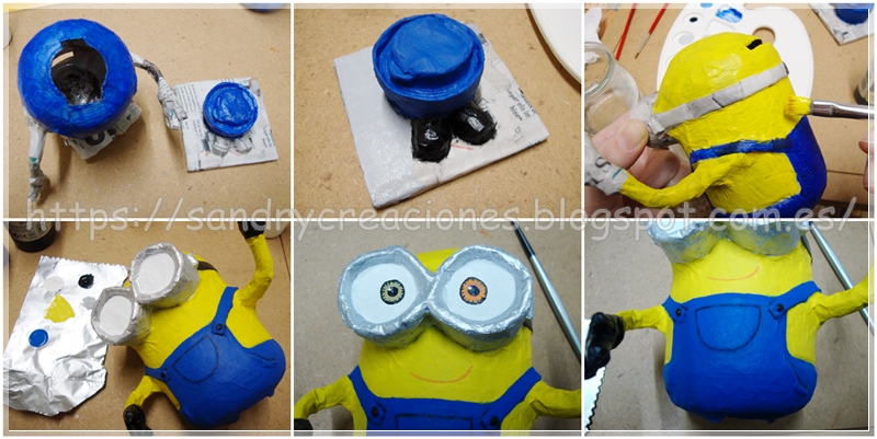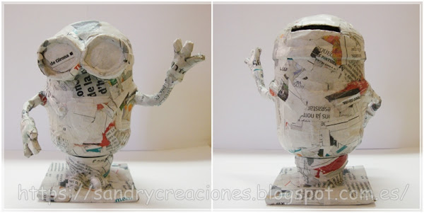 Tras esto solo nos faltaba dar dos capas más de dureza al Minion. Con trozos de papel de periódico y cola rebajada con agua volvimos a cubrir todas las partes del Minion para que quedase bien consistente. Acabando así toda la estructura de la hucha Minion Bob: