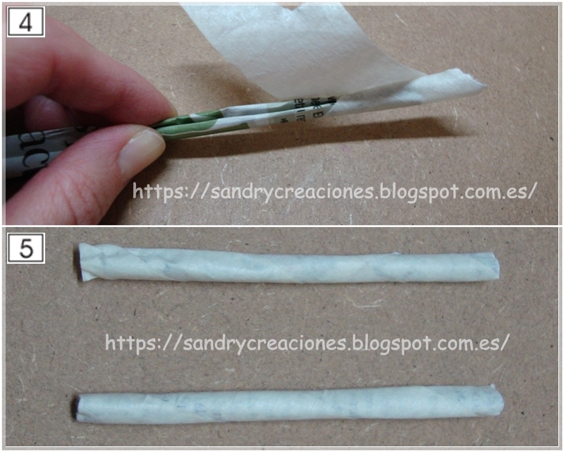 Para realizar los brazos cogimos una hoja de papel de periódico, enrollamos un trozo de ella formando un churrito y cuando tuvimos el grosor que queríamos, cortamos la parte sobrante y la sujetamos por sus puntas con cinta de carrocero (imagen 1). Seguidamente partimos ese churrito por la mitad (imagen 2) quedando dos churritos con los que haríamos los 2 brazos. Para que los brazos quedaran más compactos doblamos esos churritos por la mitad (imagen 3) y los cubrimos enteros con cinta de carrocero (imágenes 4 y 5).