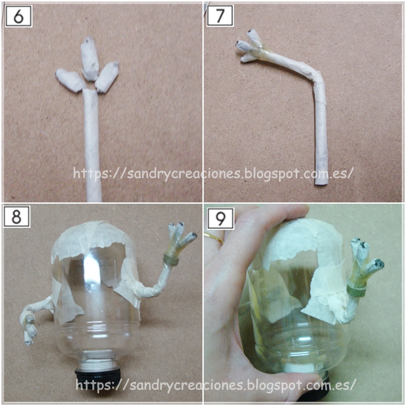 Una vez tuvimos los brazos preparados nos pusimos a confeccionar las manos con tres bolitas de papel de periódico alargadas y cubiertas de cinta de carrocero (imagen 6). Después unimos los dedos a cada uno de los brazos (imagen 7) con cinta de carrocero y con esa misma cinta nos ayudamos a darle la forma adecuada al brazo y a los detalles de los guantes del Minion. Cuándo tuvimos terminado los brazos los pegamos en el lugar adecuado del cuerpo del Minion con cinta de carrocero (imágenes 8 y 9).