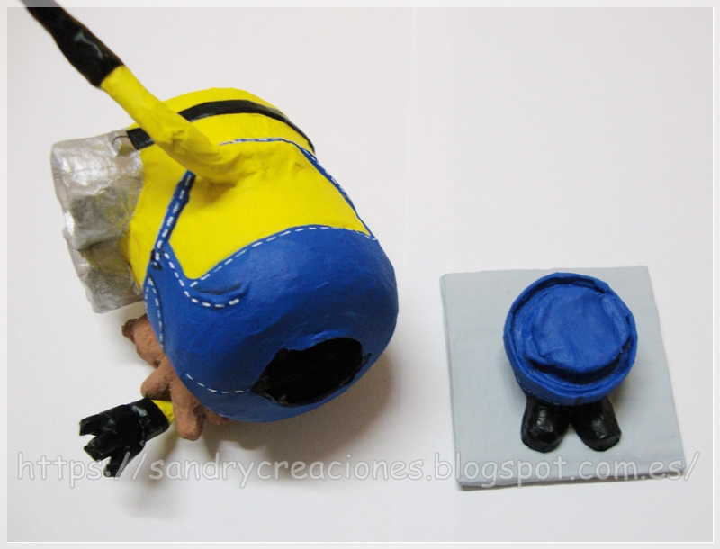 Dejamos secar bien esa primera capa de endurecimiento y seguidamente nos pusimos a realizar los detalles de la base y los pies del Minion, las gafas y el traje del Minion.