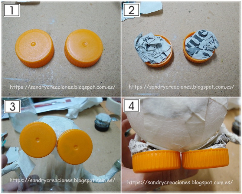 Para realizar la forma de las gafas primero se nos ocurrió utilizar dos tapones de plástico de botellas de agua pero los probamos en el Minion y nos parecieron demasiado grandes, así que buscamos por casa a ver si había algunos de más pequeños y los encontramos en los tetrabriks de azúcar que tenían la medida exacta que buscábamos (imagen 1). Con papel de periódico les terminamos de dar forma, para que encajasen bien en la cabeza del Minion y quedasen rectos (imagen 2 y 3) y los pegamos al cuerpo del Minion con cola blanca formándole las características gafas (imagen 4).