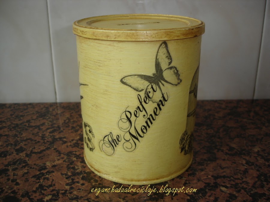 Di una mano de látex para proteger la pintura y con el mismo látex pegué alrededor del bote las imágenes para hacer los transfer. Dejé secar y al día siguiente eliminé el papel frotando en círculos con el dedo humedecido hasta dejar solo las imágenes.