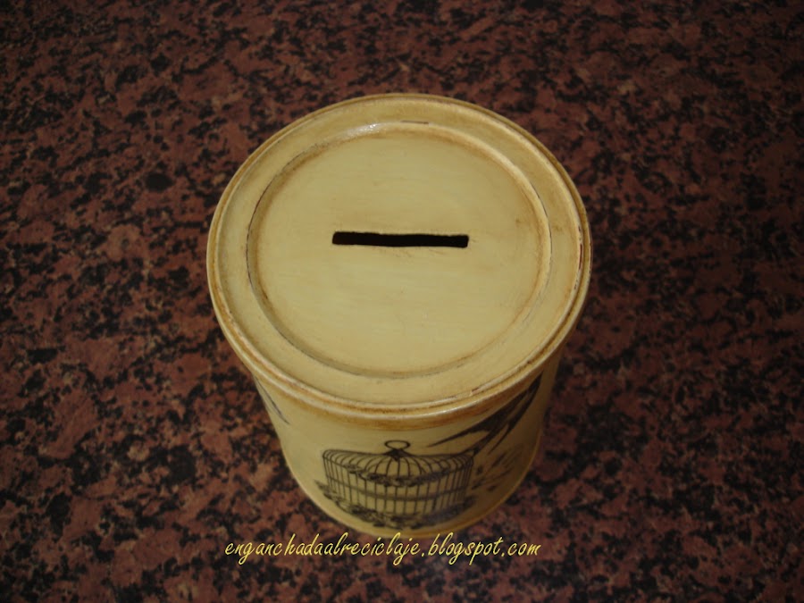 Empecé haciendo en la tapa la ranura para meter las monedas. Luego dos manos de imprimación y otras dos manos de pintura acrílica color marfil, dejando secar bien entre mano y mano y lijando un poco para alisar.