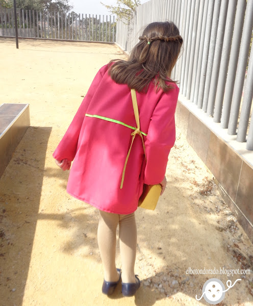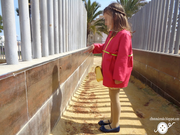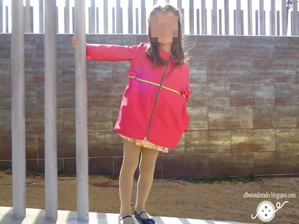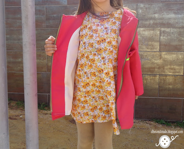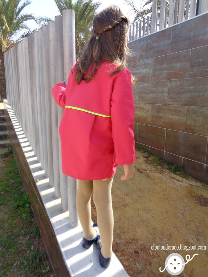 En lugar de abrigo, he hecho una versión de chaqueta de entretiempo utilizando gabardina en color rosa fucsia. Para darle un toque de color, he puesto bies alrededor de la chaqueta en color flúor.