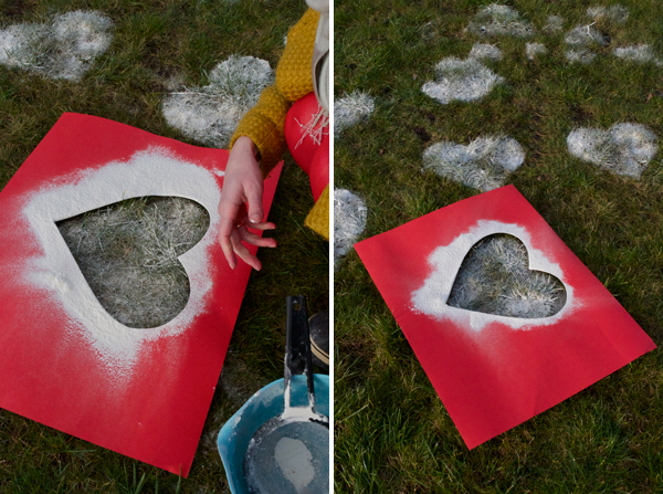 Son una huellas de corazón en el césped, también podéis hacerlas dentro de casa con, por ejemplo, purpurina roja :) Para éstas en concreto se utiliza harina. Sólo necesitas una cartulina grande, hacer el agujero con forma de corazón y espolvorear la harina (con un tamizador o colador) o purpurina para que os quede la forma.