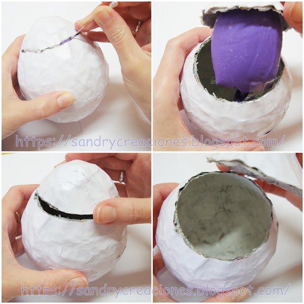Paso 6. Pulir los bordes de las dos partes del huevo. Cortamos pequeños trozos de papel blanco y los vamos pegando con la mezcla de cola blanca y agua en todo el borde del huevo y de la tapa del huevo, así, además de pulirlos y reforzarlos, conseguimos un mejor encaje entre las dos piezas.