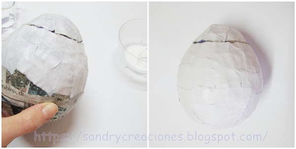 Paso 4. Cubrir el globo con una capa de papel blanco para reciclar. Seguidamente y ya para finalizar con la estructura principal del huevo, con el mismo procedimiento de los dos pasos anteriores, realizamos una capa de papel blanco que tengamos por casa para tirar, nos dará mucha resistencia y dureza y nos dejará una superficie más pulida y ya preparada para pintar. Otra opción es sustituir esta capa de papel blanco por una capa de pintura blanca o imprimación para que después podamos pintar el huevo sin que se transparente el papel de periódico.