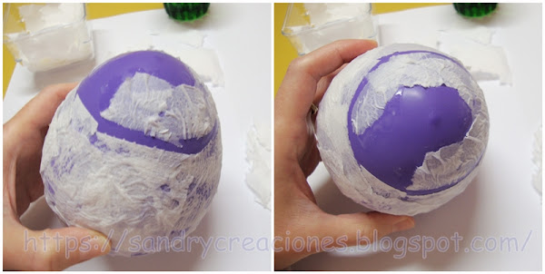 Dejaremos una pequeña separación en uno de los extremos del globo para así tener separada la parte que hará de tapa de nuestro huevo. Antes de poner una segunda capa dejamos secar bien la primera y seguidamente hacemos lo mismo, con la mezcla de cola y agua vamos pegando trozos de papel de cocina por toda la superficie de nuestro huevo.