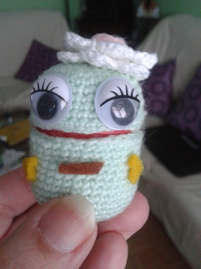 Mirando en internet para ver que podía hacer con las fundas de los huevos cubiertos de chocolate, vi unas fundas muy curiosas con distintas formas, animales, frutas,... y como tenía una flor de ganchillo que había realizado para hacer un anillo a mi sobrina, que luego no se llevó a efecto, comencé ha tejer y forrar el huevo de plástico y tejiendo y tejiendo salió este gracioso ser (o por lo menos a mí me lo parece)