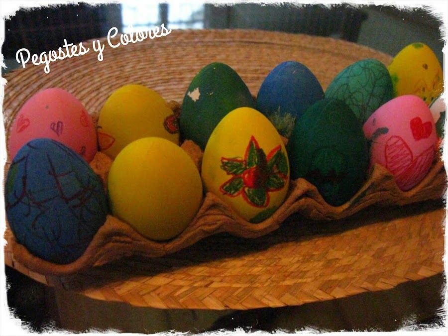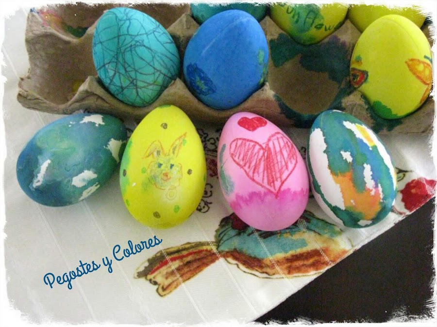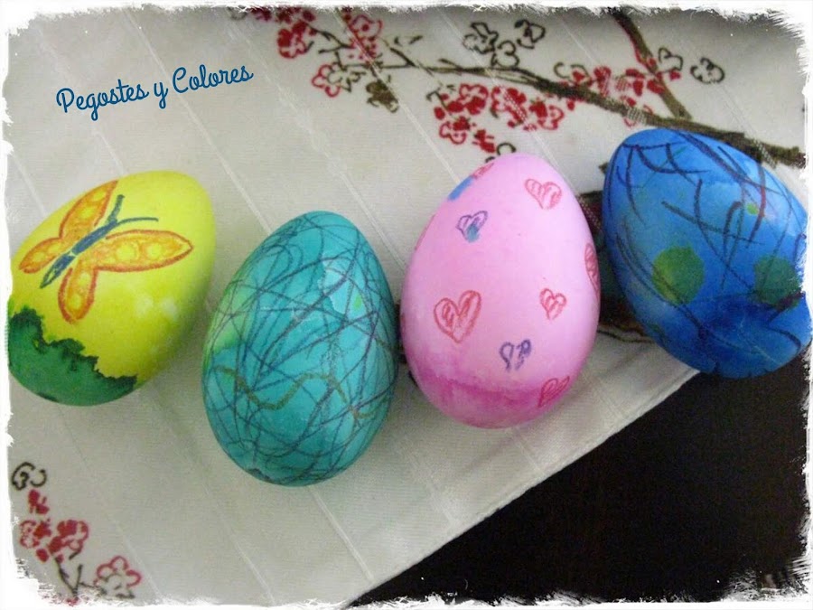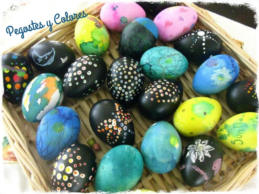 5.- Para otros huevos, mi hija quiso verter gotas sobre el huevo de diferentes colores y le quedaron geniales. Los de crayon quedaron muy lindos también porque el crayon resiste a la tinta de color.