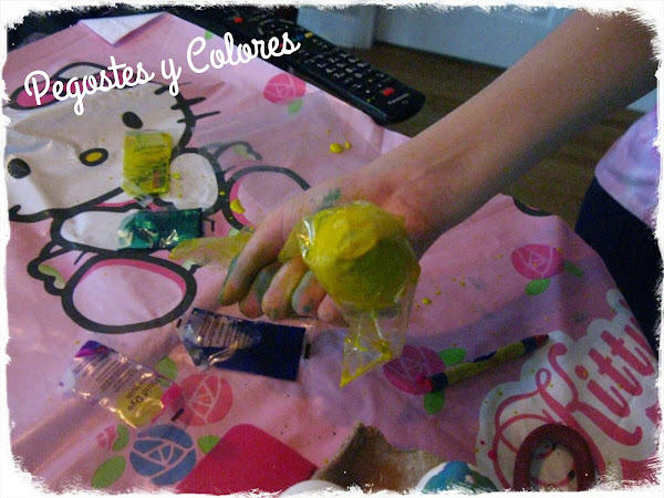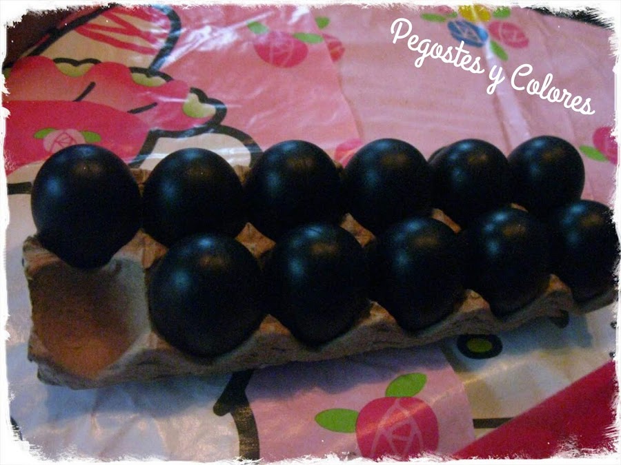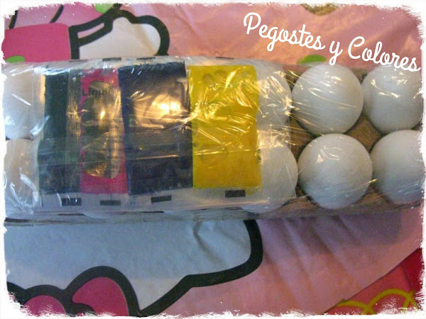 1.-Los huevos blancos como dije, son de plástico pero tienen una superficie porosa. El kit incluye la pintura liquida en sobres que es no toxica y de color brillante y bolsas de plastico. Primero protegimos el área de trabajo con un mantel plástico.