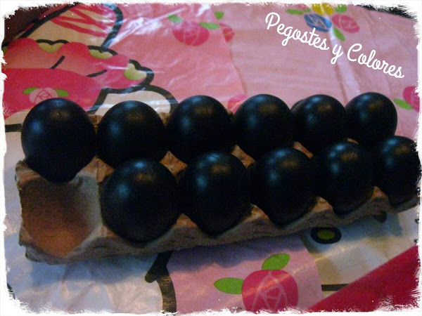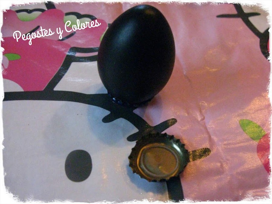 1.- Para los huevos de pizarra es importante tener una tapa o corcholata de botella o envase de leche donde apoyar el huevo para que no se mueva mientras se trabaja sobre el. Vienen ya listos con una superficie negra porosa con pintura de pizarra y el kit incluye gises de colores.