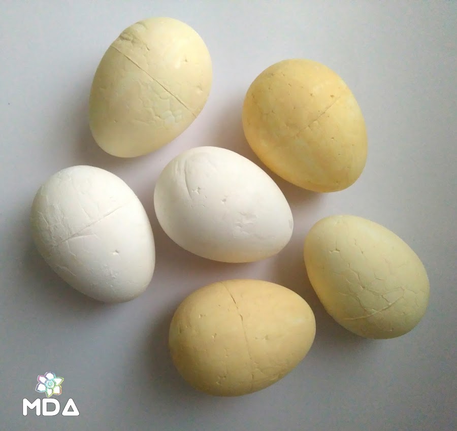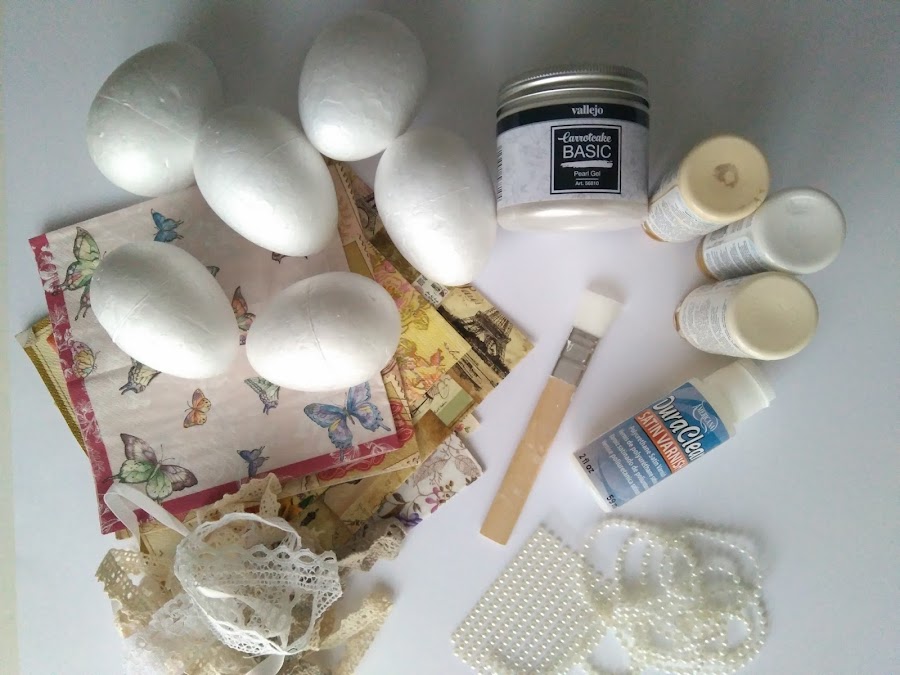 Lo primero era dar color a los huevos, como tenía seis decidí pintar dos de cada color (blanco, crudo y crema) además a los de color blanco les di una capa de gel perla para conseguir un efecto nacarado.