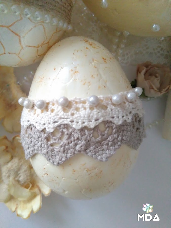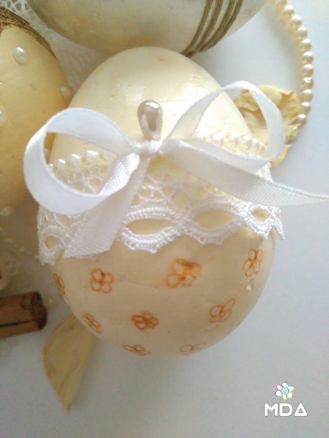 Para estos huevos de Pascua pegué puntillas con pegamento líquido en torno a ellos, en el primero, además, he ido clavando alfileres que decoran y fijan la decoración. El segundo lleva una tira de perlas, lazo de raso y en la parte inferior unos adornos dibujados con un bolígrafo de gel en tono beig.