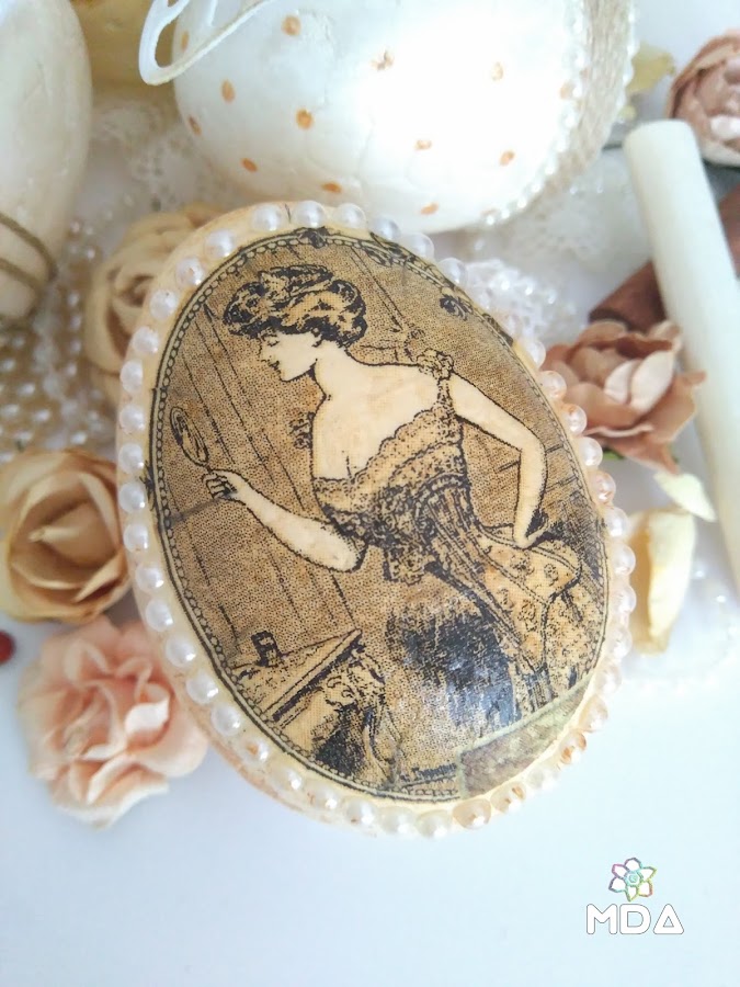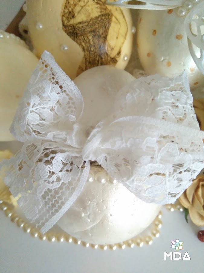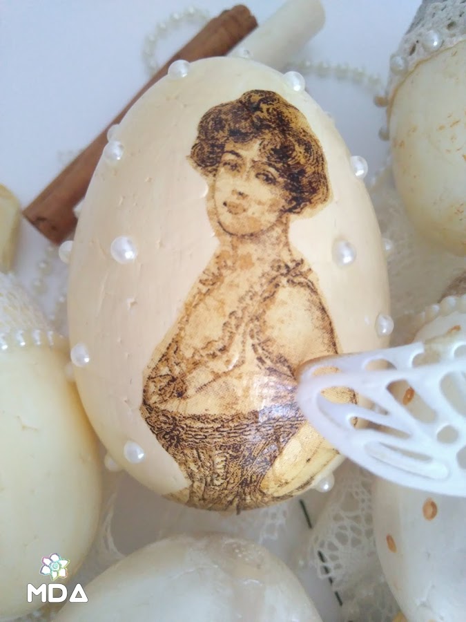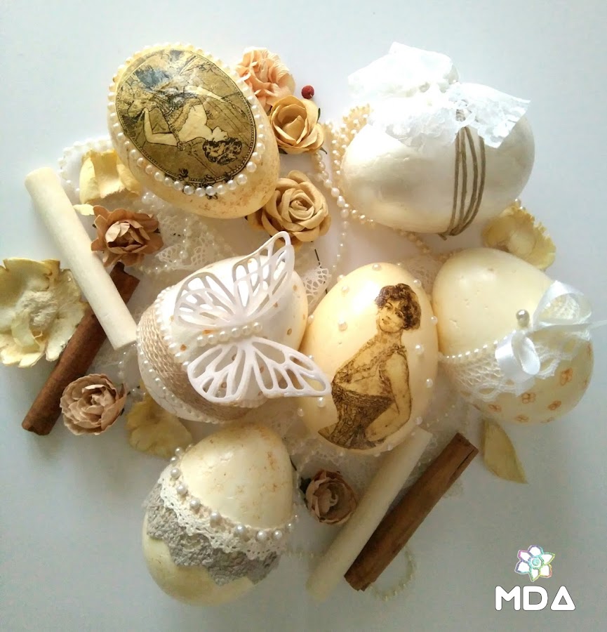 También he incluido decoraciones más rústicas como la liza que lleva el huevo de la izquierda o la cinta de saco del de la derecha y que he completado con un lazo de puntilla blanca o este troquelado de mariposa Monarca en cartulina blanca y papel vellum que me encanta. Y por supuesto, más perlas.