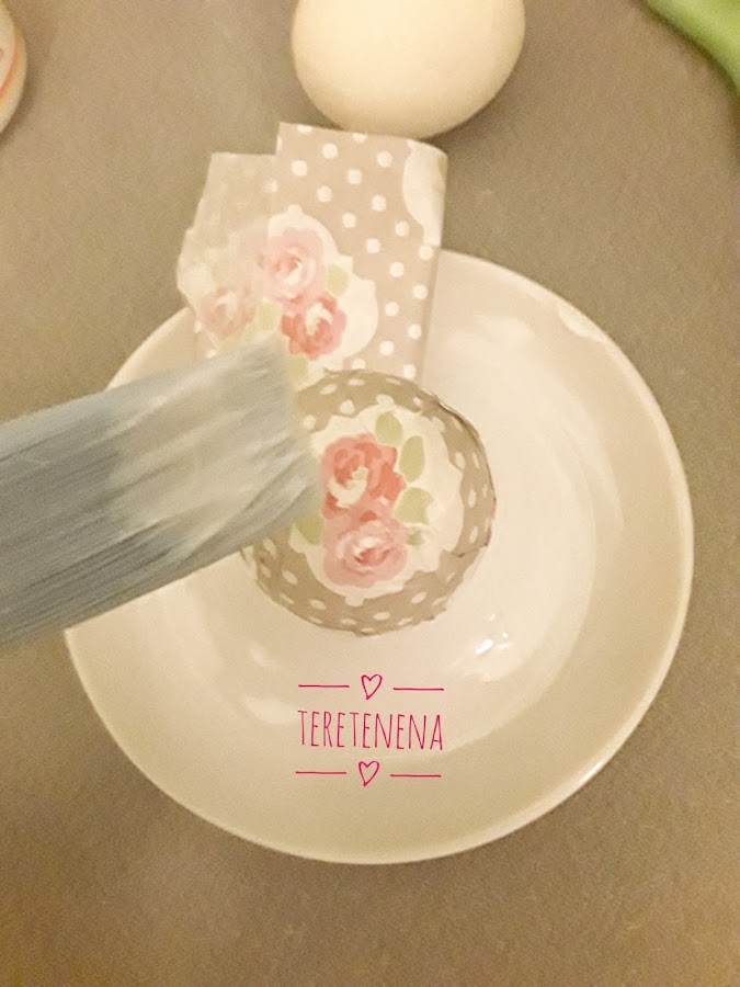 Conforme vamos envolviendo, hay que ir quitando las arrugas del papel pegado en el huevo, y, después, aplicamos otra capa sobre el papel de cola para decoupage.