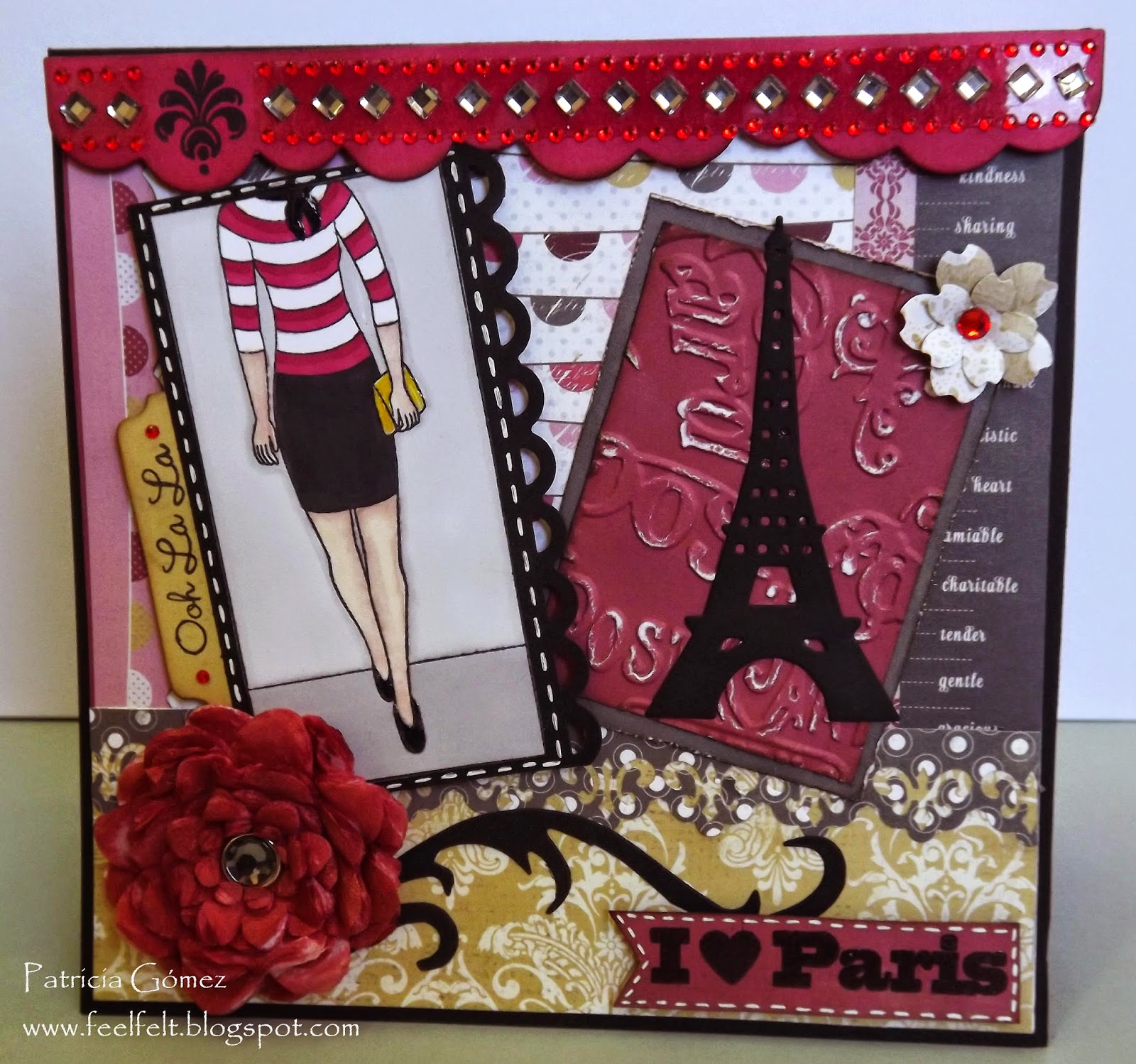 El sello principal usado de la señorita sin cabeza es de My favorite Things, Who´s that parisian girl. Es una pena que MFT haya descatalogado estos sellos, porque a mi me resultaban muy bonitos y "ponibles", y de hecho tengo otros trabajos con ellos (por si os apetece recordarlos, aquí, aquí y también aquí) ^_^