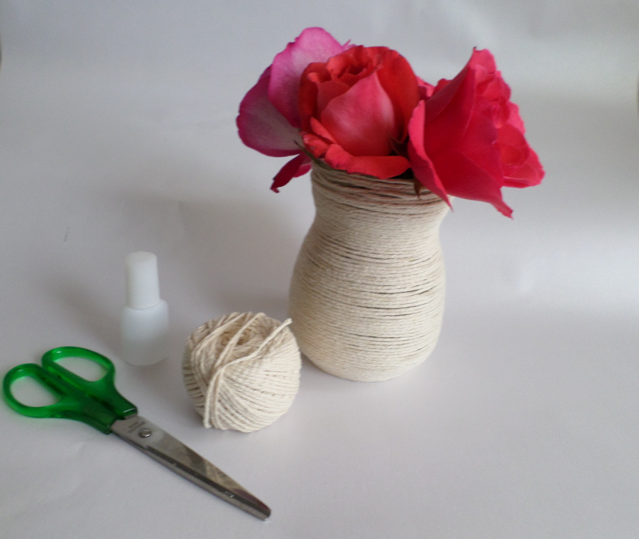 Para el último, ahí tengo que decir que no he sido para nada original, sino una envidiosa. Hace mucho que está de moda la decoración shabby chic y uno de los elementos estrella son este tipo de jarrones, así que con muuucha paciencia y armada de cuerda (o lana) y pegamento (todavía tengo restos en las manos, me parece que voy a comprar un buen disolvente para estos temas) he ido pegando la cuerda cada poco y dándole vueltas de abajo a arriba (aunque podéis hacerlo de arriba a abajo, eso es decisión de cada un@) me ha quedado este florero tan sencillo a la vez que bonito (la verdad es que me "chifla").