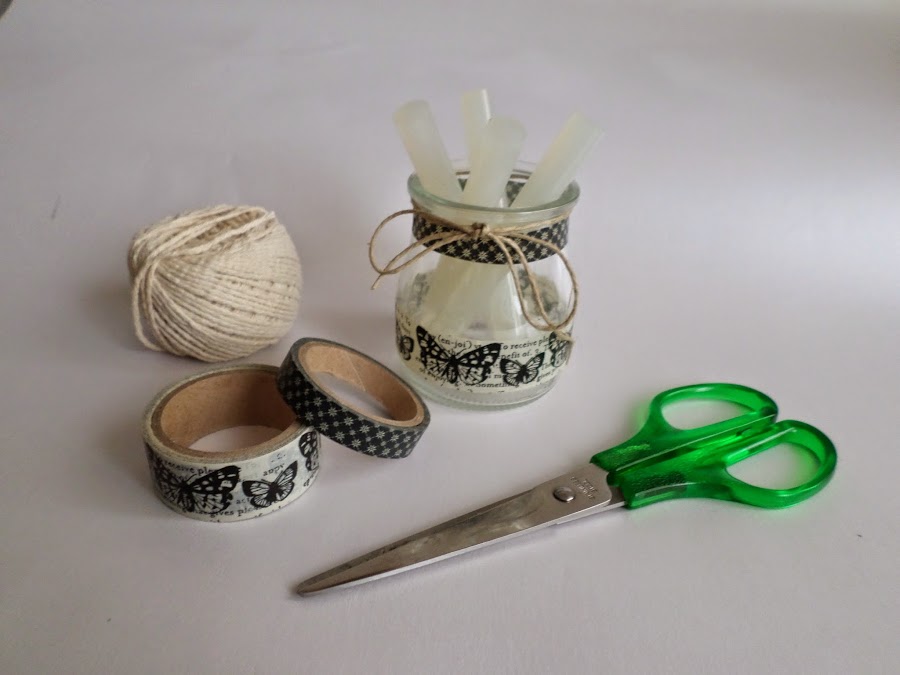 Para este segundo, utilicé un frasco de yogur un poco más clásico, dos washi tapes distintos pero a juego y un poco de cuerda. Si no tenéis washi tape, podéis utilizar una servilleta con algún dibujo o patrón bonito y cola diluida para pegarlo (es un poco más pringoso, pero el resultado es el mismo) y si no tenéis cuerda, la lana puede ser también un buen aliado.