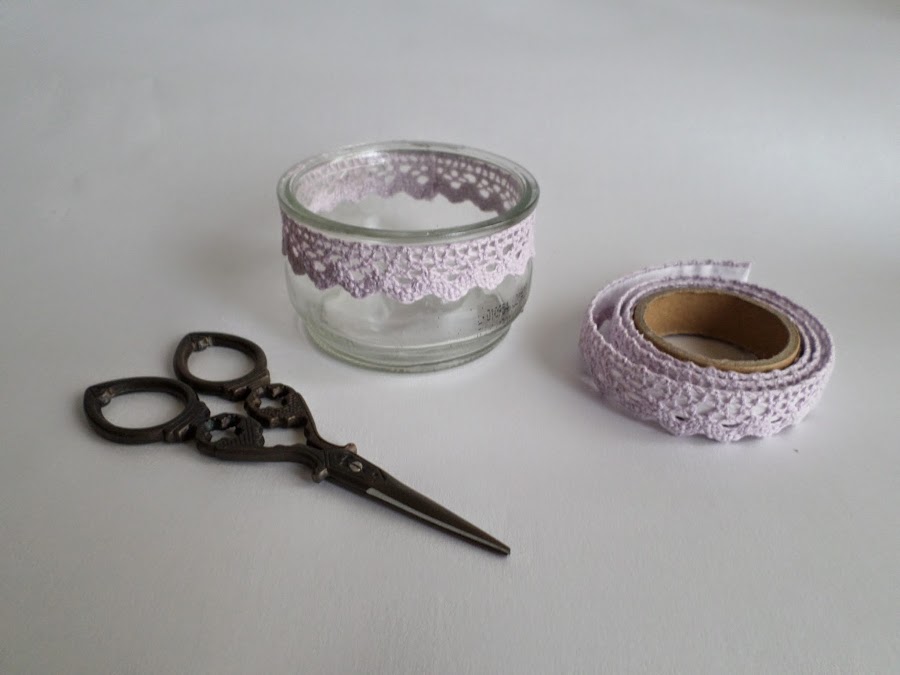 Este primero que os presento es muy sencillo. Es un bote de yogur (o mousse de chocolate) al que le he puesto fabric tape (cinta de tela con adhesivo) alrededor. Si no tenéis este material, otra opción es ponerle una puntilla con cola (diluida o no) o pegamento. El uso? A mí me está pidiendo una velita dentro para esas veladas románticas, jeje.