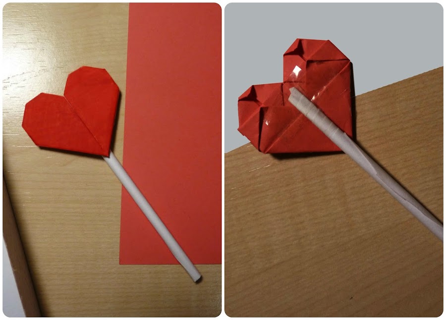 Hacerla es supersencillo, para hacer el corazón se necesita sólo un cuadrado de papel de unos 14cm, y las instrucciones las podéis encontrar en un video genial en la misma página organizadora del reto. Y para el palito basta con enrollar otro cuadrado de papel blanco, hasta hacer un canutillo.