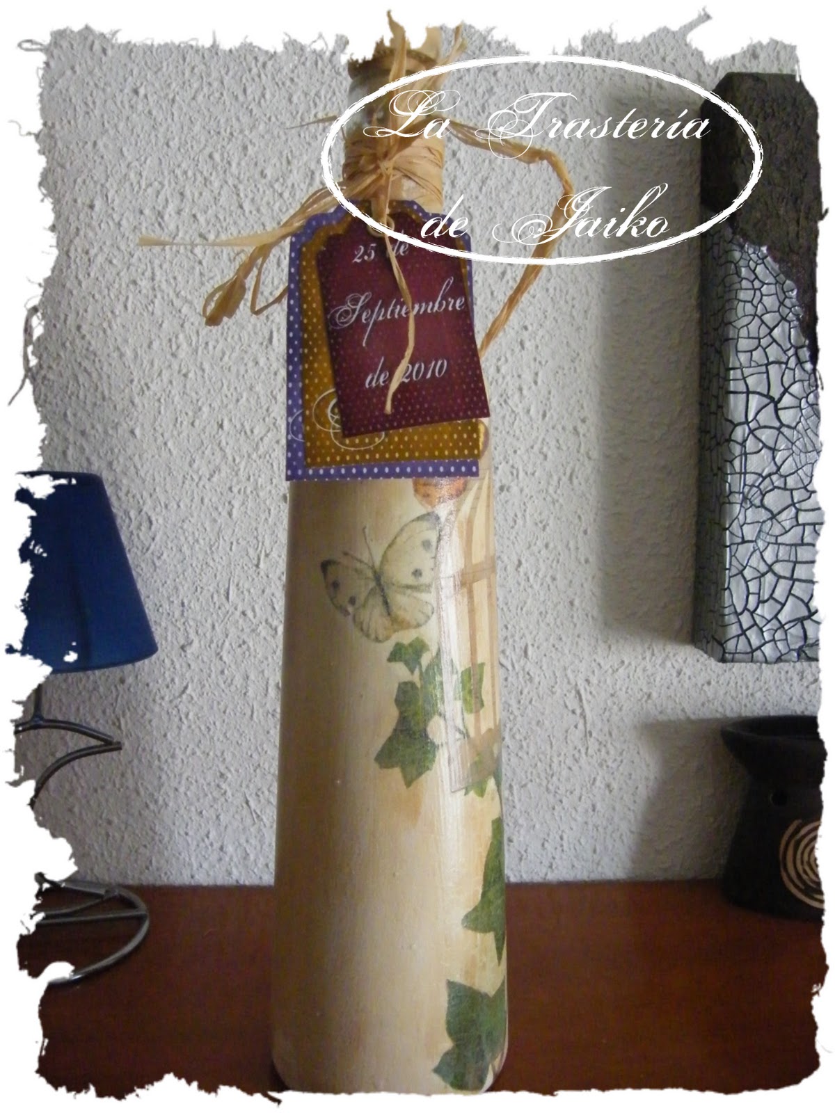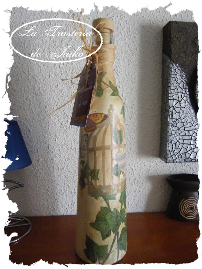 y siguiendo con las cositas de aquel día tambien viajó hasta mi casa la botella con la que celebramos tan ilustre momento (vacia claro y dispuesta a dejarse hacer...), jajajja 40 tacos no se cumplen todos los días y menos con semejante compañía!! y tambien voló para allí, contando con los motivos que lleva en decoupage una pequeña historieta... el pajarito que vuela libre fuera de su jaula. entre hiedras y haciendo de sus palabras una preciosa melodia...