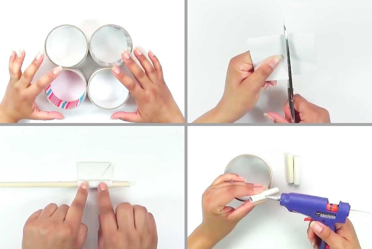 – 4 Tubos de cartón de cintas (O latas de atún)– Cartón