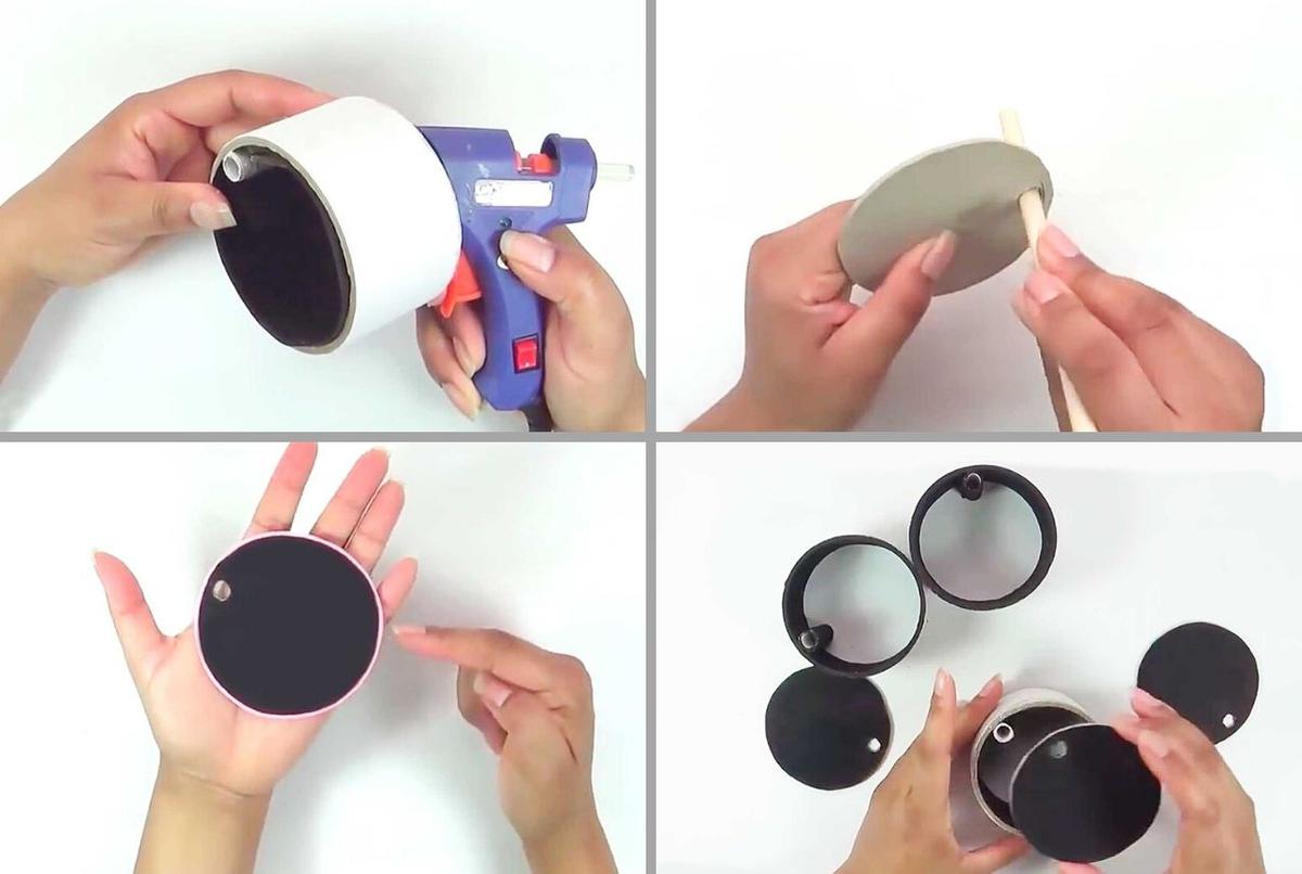 Pegar 4 de los círculos de cartón ya forrados en el fondo de los 4 tubos de cartón.