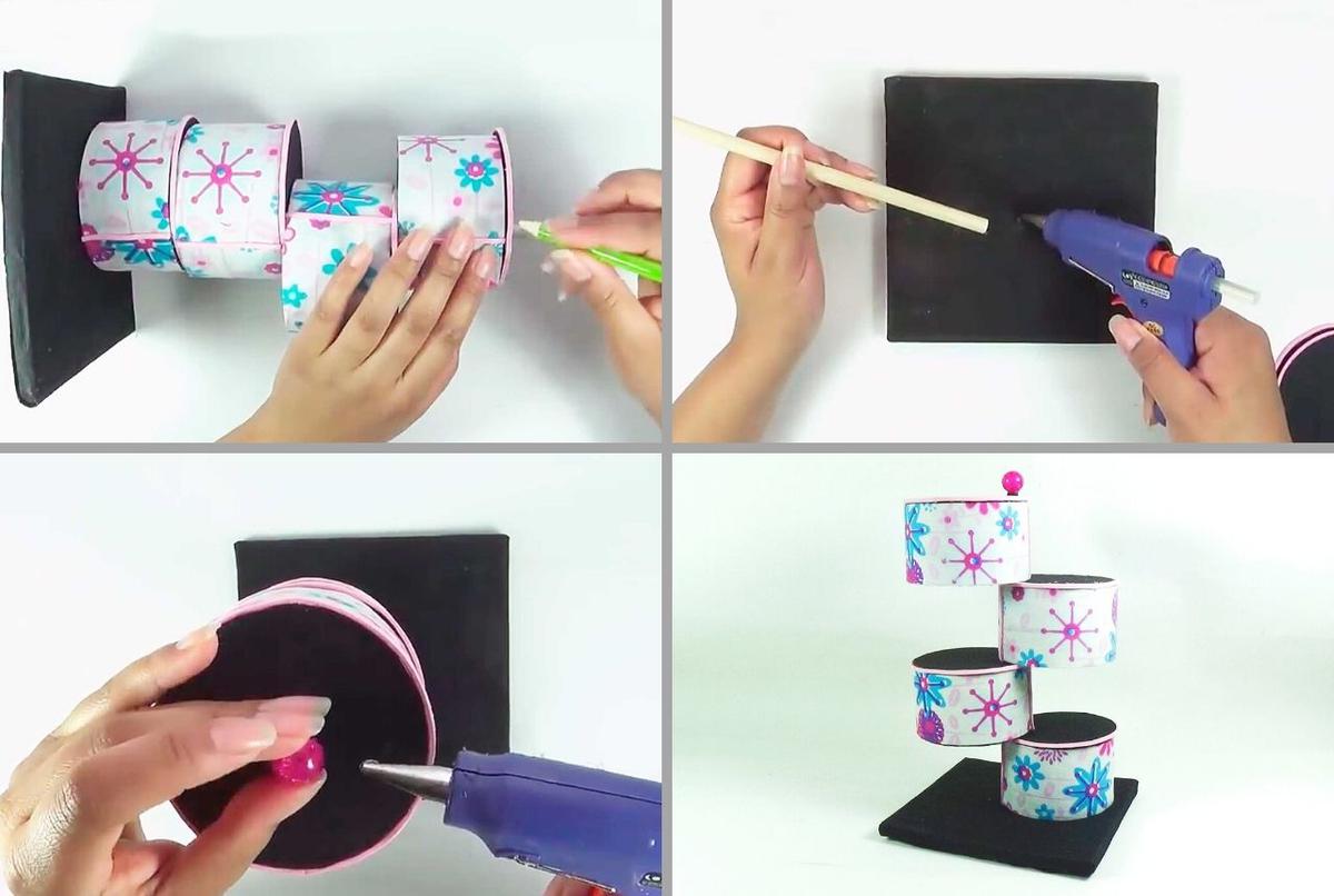 Tomar el palito de manualidades que usarás como pilar y enrolla los trozos de tubos de cartón de papal higiénico, pégalos con cinta de carrocero para mantener la forma, esto será la sujeción del pilar en cada estante.