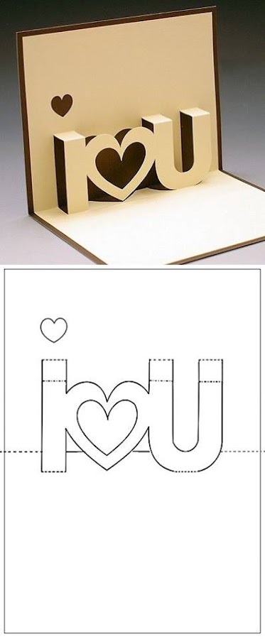 Preciosa tarjeta con efecto 3D "I ? U". Sólo necesitas dos hojas de diferentes colores y seguir la plantilla. Recorta las líneas continuas y dobla las discontinuas. Pégalo a la hoja de fondo y ¡voilá! ya tienes una tarjeta, original, romántica y única ;)