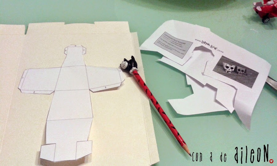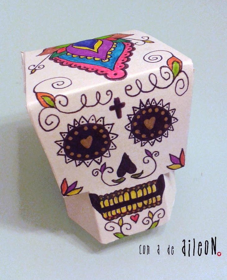 Obtendréis el patrón de AQUI, solo hay que imprimirlo, dibujar lo que queráis en la cara y montar. Yo empecé imprimiendo la hoja, recortando y usándola como base para un cartón de cereales (así la calavera tendrá más consistencia).