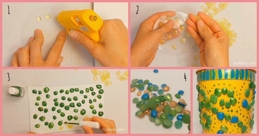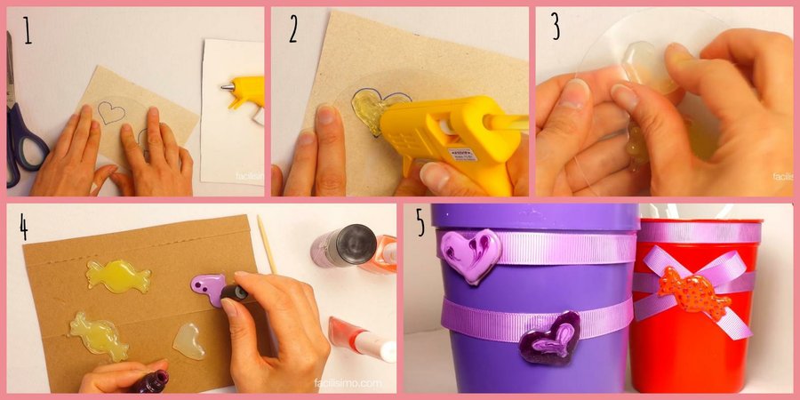 Consiste en aplicar gotas de pegamento termofusible o silicona caliente sobre un plástico grueso, pero flexible. Cuando estén secas, retíralas del plástico y ponlas sobre un papel o cartón para darles color con los esmaltes. ¡Sólo queda utilizarlas para decorar todo aquello que se te ocurra!