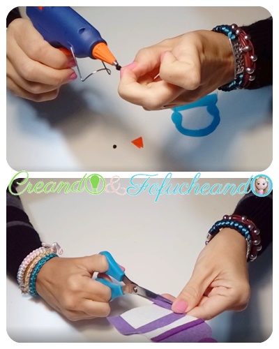 La bufanda será larguiiisima. La colocaremos en el cuello y haremos un doblez en cada esquina. Pegaremos una gotita de silicona solamente ahí,en esa parte de arriba pa que le quede sueltecita por ambos lados,y de nuevo lo damos todo con las tijeras haciendoles flecos verticales.