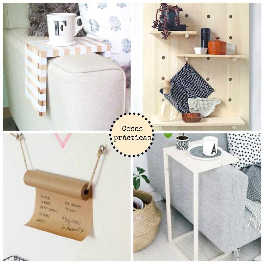 Siendo un poco mañoso es suficiente para poder hacer las cosas que hoy os muestro. Me encanta el rollo de papel para las dichosas listas de la compra, o las maderas puestas encima del brazo del sofá para apoyar un café o una lámparita.