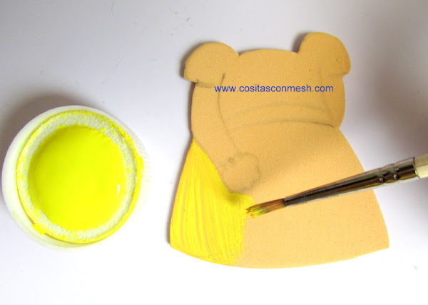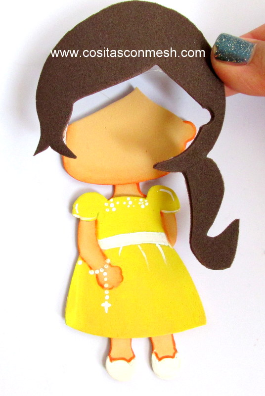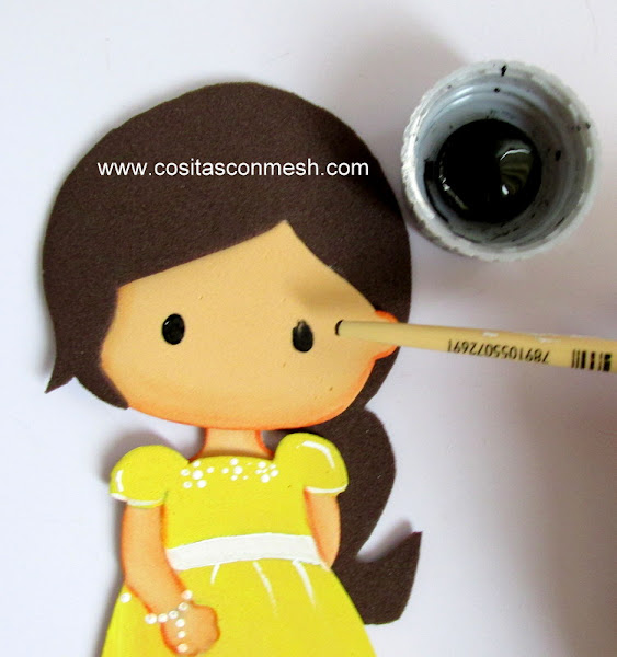 4.- Con pincel pequeño de pelo fino, pinto el vestido de color amarillo.