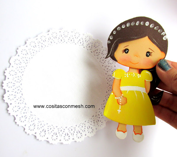16.- Esta es mi blonda o carpeta de papel, sobre el pego mi figura de la niña de bautizo.