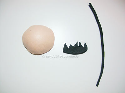 Atacamos primero la cabeza,esa media bolita del Nº 3.La forramos por la parte abultada con la pieza de Goma eva color carne de 4x4,a la que previamente le habremos aplicado calor acercándola a la plancha o a una vela,para que sea más manejable y el acabado de lujo.