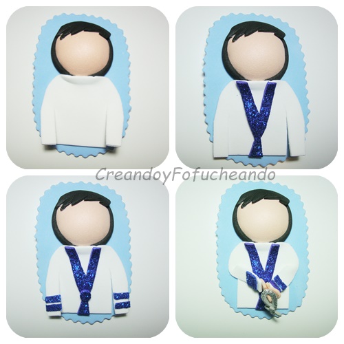 En realidad es una manualidad sencilla: cabecita y medio cuerpo,sin piernas,y lo mejor es que puedes personalizarlo con los modelitos que lleven los niños en ese día tan importante y especial para ellos.