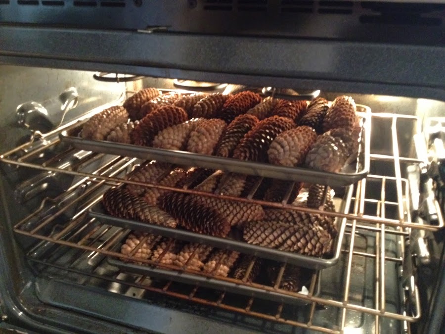 Antes de trabajar con piñas, y para asegurarnos de que no tienen ningún incómodo o inesperado inquilino, lo mejor es hornearlas en un horno convencional a 200º durante unos 20 o 30 minutos para eliminar todos los posibles bichillos. Luego, lo dejaremos secar al aire sobre una superficie seca y listas para trabajar con ellas!!