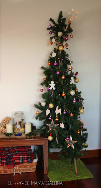 Otras de las cosas que quería hacer este año era cambiar el árbol de Navidad, porque el mío era altísimo y sobre todo anchísimo y me ocupaba medio salón. Así que he cogido 3 cañas de bambú largas, las he unido formando un "tippi" y las he forrado con las ramas de mi árbol, que he ido desmontando poco a poco. Me encanta cómo ha quedado porque sigue siendo alto, pero muchísimo más estrecho. Además estoy aprovechando el resto de las ramas para decorar la casa, como la que he utilizado para hacer el colgante de la entrada. Mi hijo dice que se le ven las cañas y yo le he dicho que esa es la gracia del árbol, que sea un poco rustico.