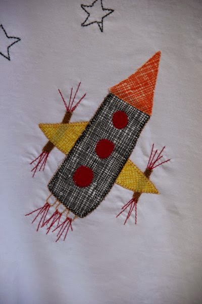 Aquí veis la que le hice a Leo, mi hijo mayor, hace tiempo. Un precioso cohete que él dibujo y en el que soñaba viajar y llegar muy lejos. Ahora tengo que hacerle otra porque esta camiseta ya le queda pequeña así que me pondré a rebuscar en su carpeta de dibujos y a ver que encuentro.