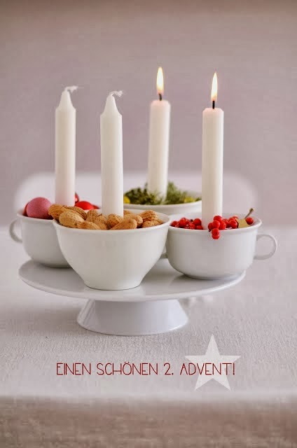 Este otro centro de mesa de Navidad es perfecto por su simplicidad, y porque podemos adaptarlo a cualquier ocasión cambiando el contenido de las tazas. También podemos cambiar el blanco por otro color, para combinarlo con la decoración navideña del resto de la casa.