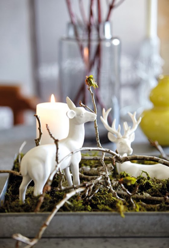 También me ha encantado este centro de mesa navideño sencillo, que iría perfecto con los servilleteros que vimos antes. Cualquier bandeja nos irá bien, ponemos encima hojas verdes y ramitas, y algunos adornos que encontremos por ahí blancos. ¿Que no tenéis adornos blancos? Os hemos ya dado la solución cuando os contamos cómo darle nueva vida a los kitch regalos de la tía con pintura blanca.